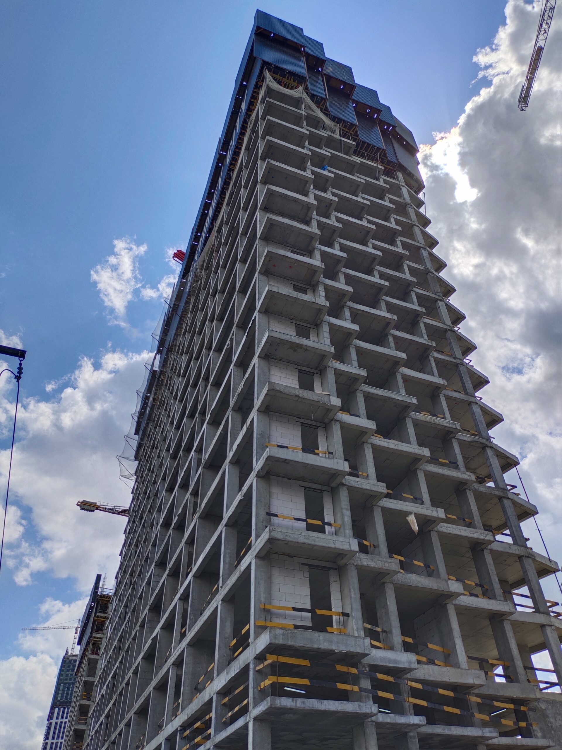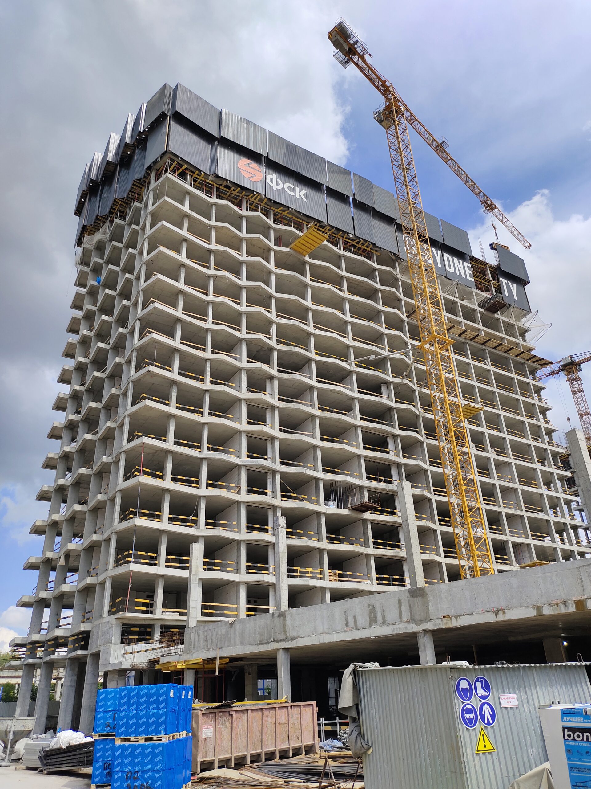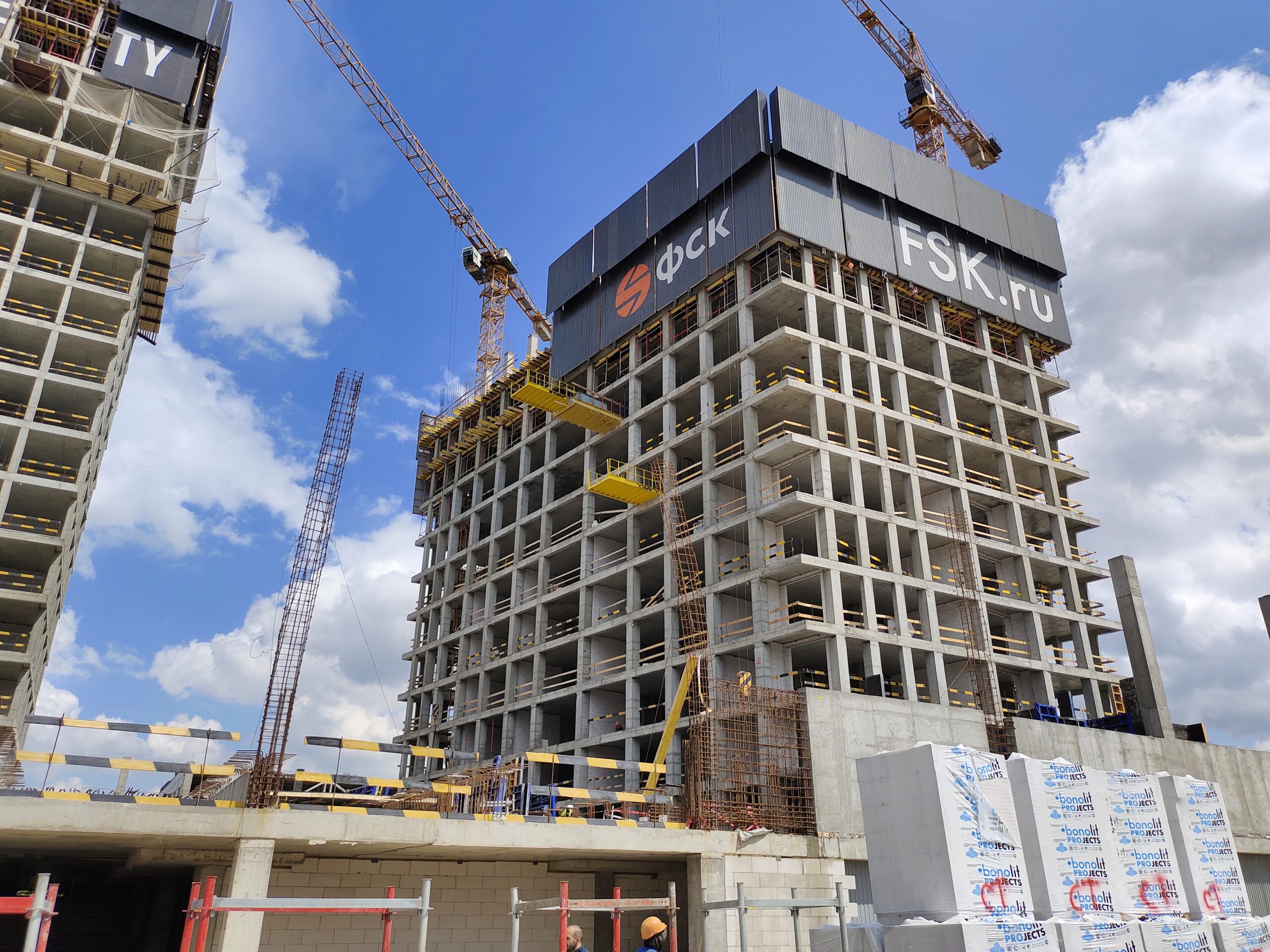 Для обеспечения безопасности проведения монолитных работ и комфортной работы на монтажном горизонте применена система ветрозащитных экранов по периметру домов.
