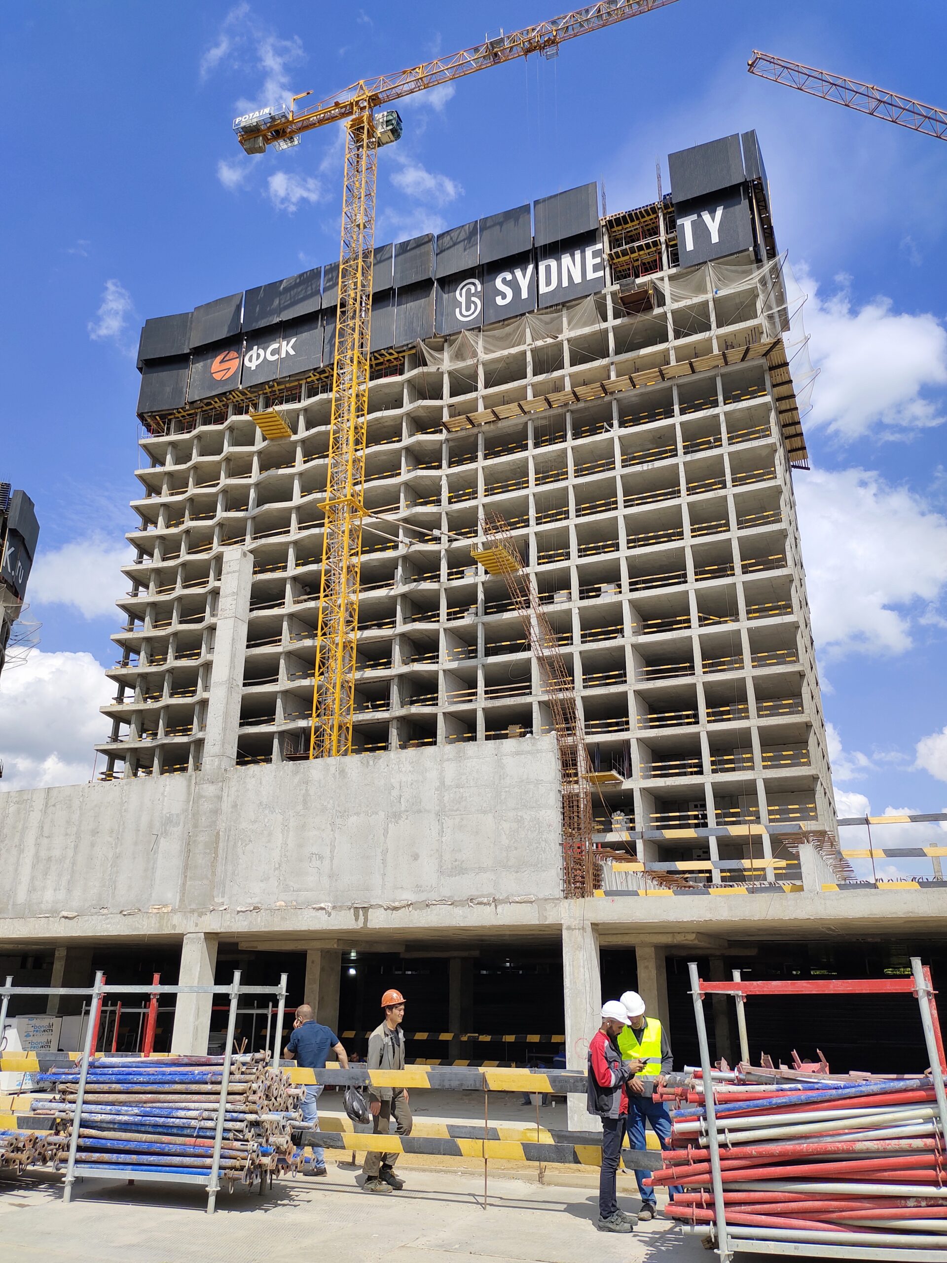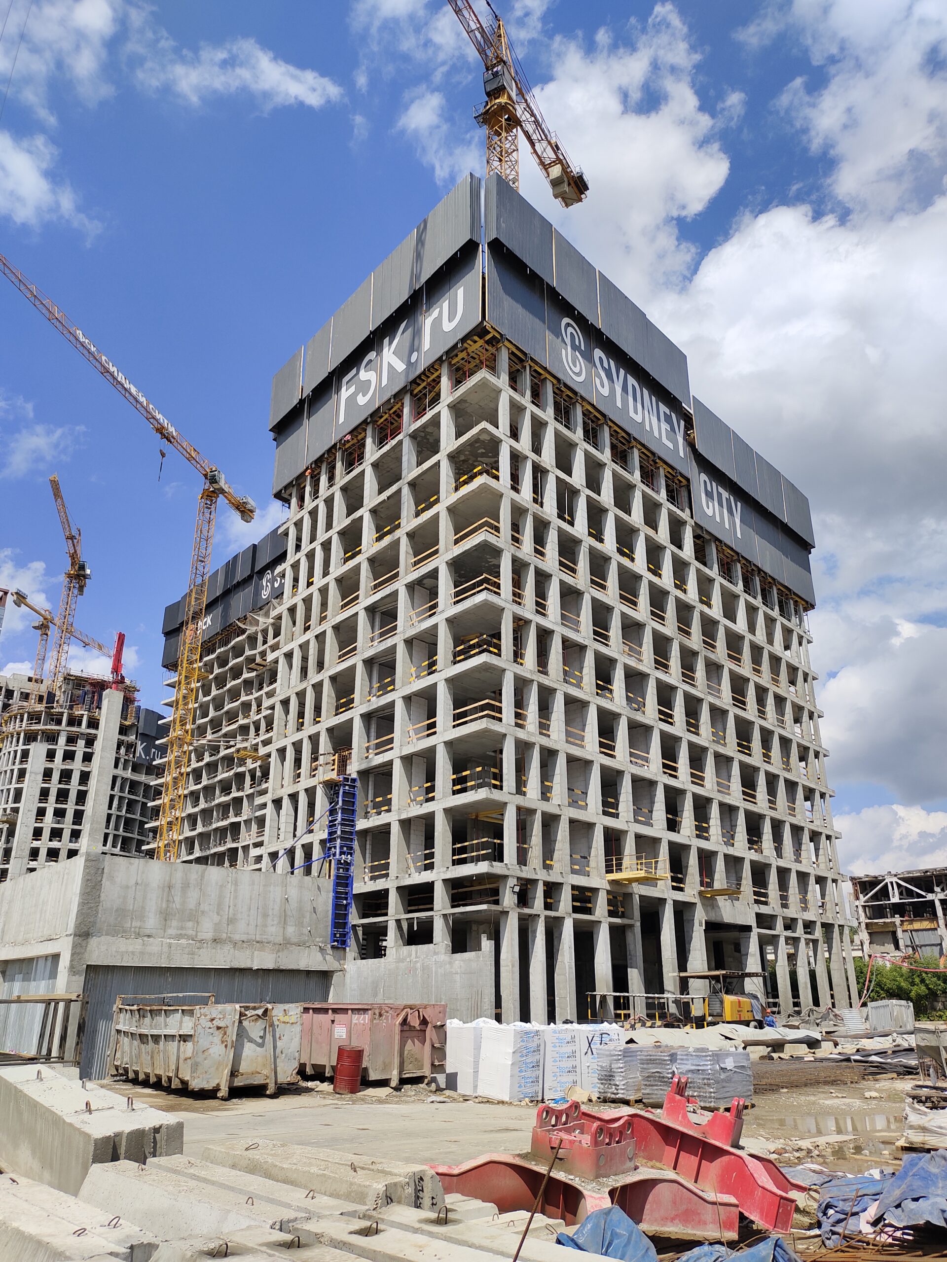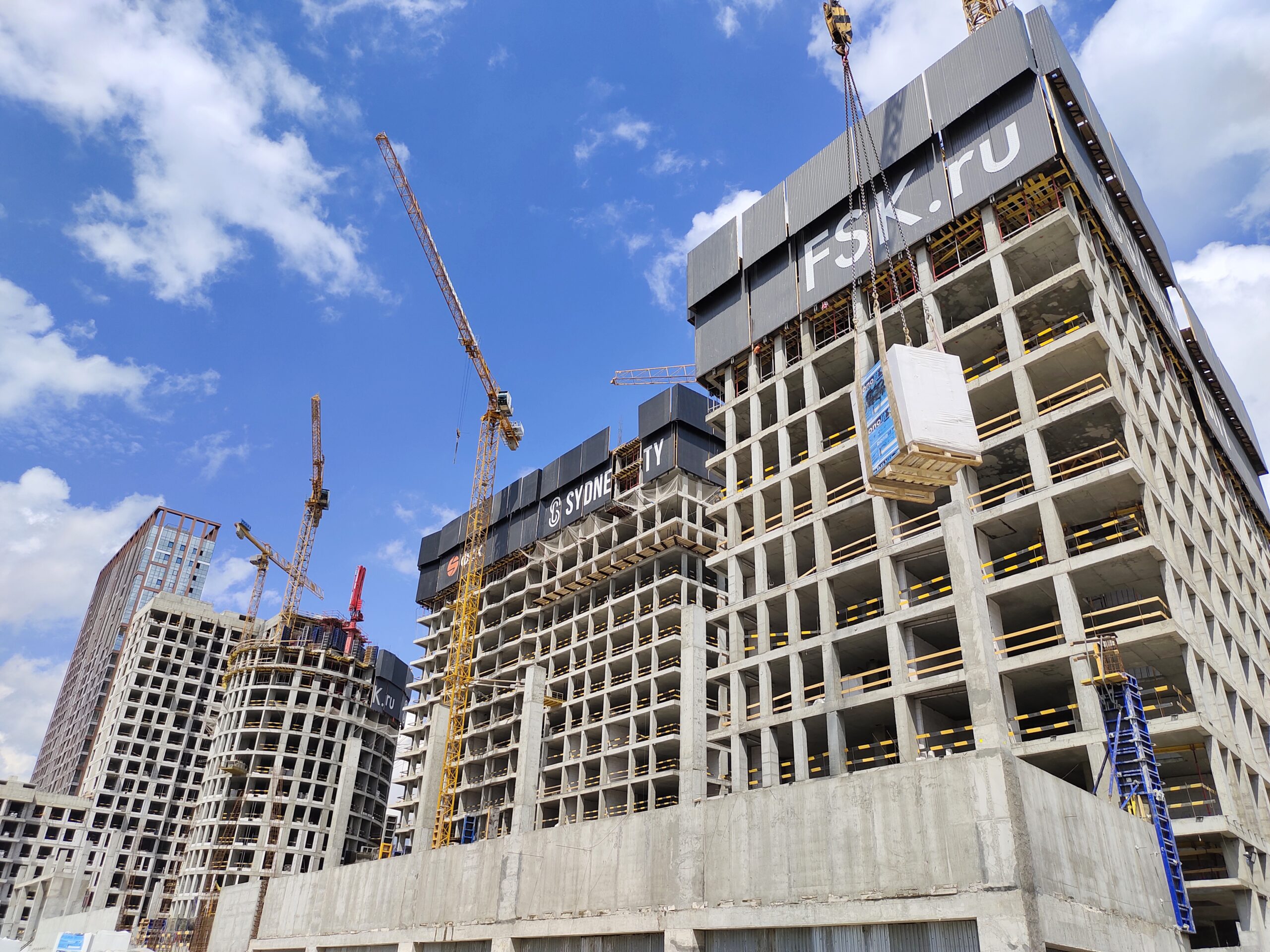 Для обеспечения безопасности проведения монолитных работ и комфортной работы на монтажном горизонте применена система ветрозащитных экранов по периметру домов.